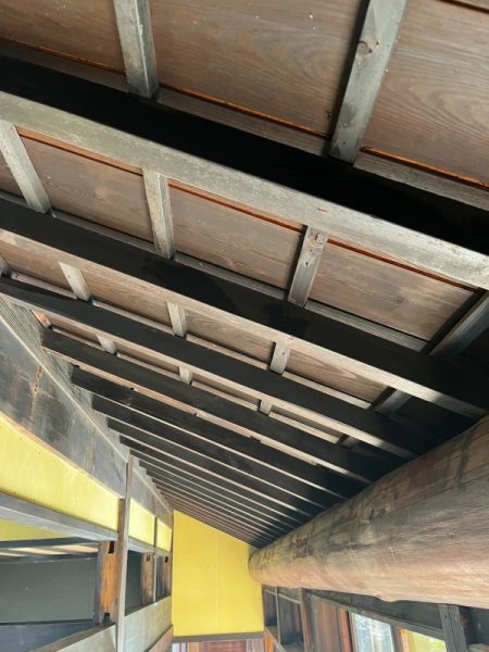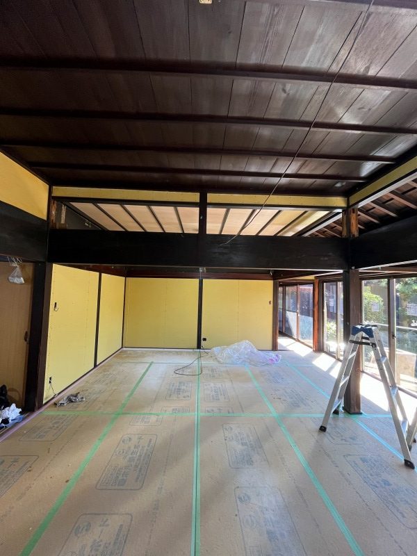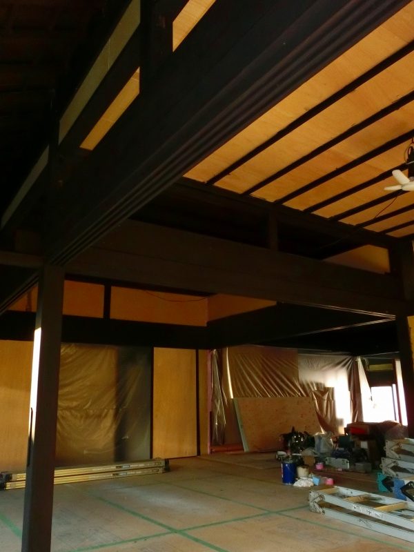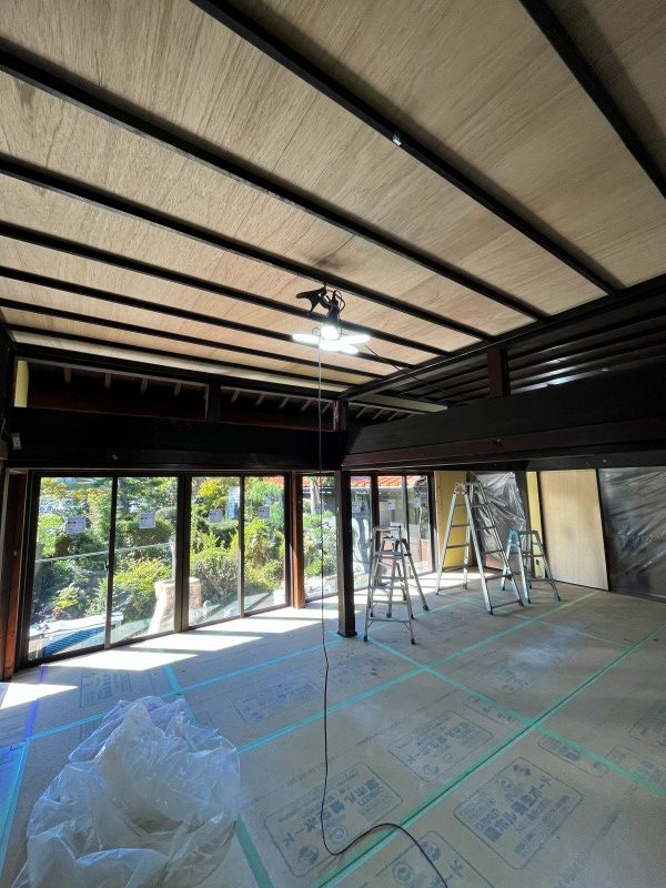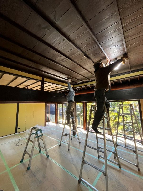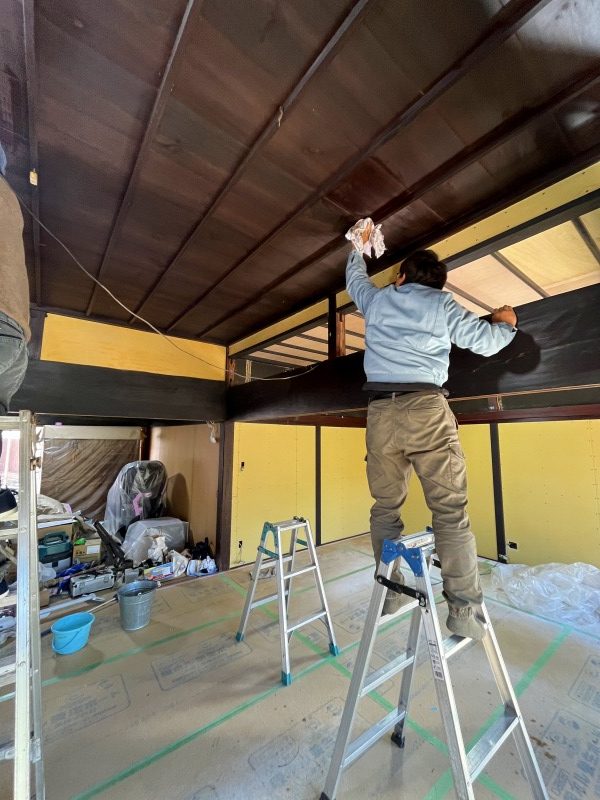 古民家リノベーションで工事させていただいている現場で、梁、柱、鴨居、天井の竿ぶちを再塗装します。