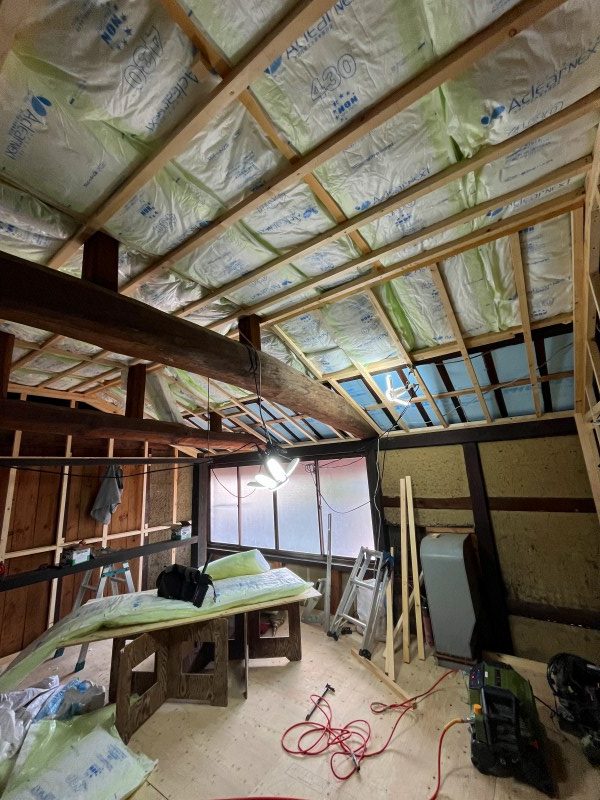 現場は既に床断熱材が施工されて、只今、天井断熱材施工の真っ最中です。