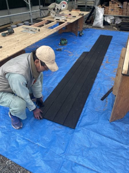 下でカットして渡す人、上で施工する人。三人の大工さんが1枚1枚焼杉を