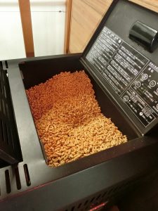 ペレットは、朝から夕方まで焚いていますが、3日で2袋くらい無くなるようです。