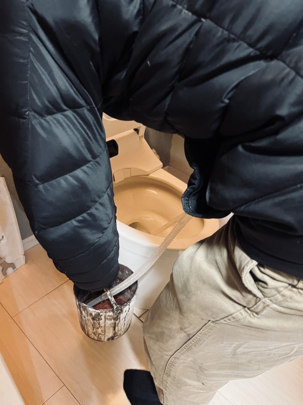 頼りになる部長の出番です!早速、ポンプで水を吸い取り古い便器を取り外します。