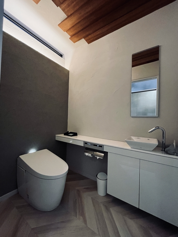 究極のプライベート空間と言われるトイレ空間。天井に木を貼ったり、間接照明で雰囲気を出したり、