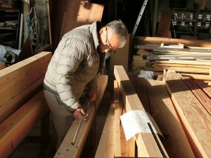 そしてトラックの倉庫では、何やら塩田社長が真剣に墨付けを行っています。