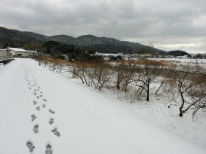 川沿いの土手には学生さんが歩いた足跡が。朝はつるつるで大変だったでしょうね。