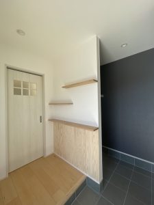 調光ロールスクリーンとキッチン背面の黄緑がアクセントになっています。
